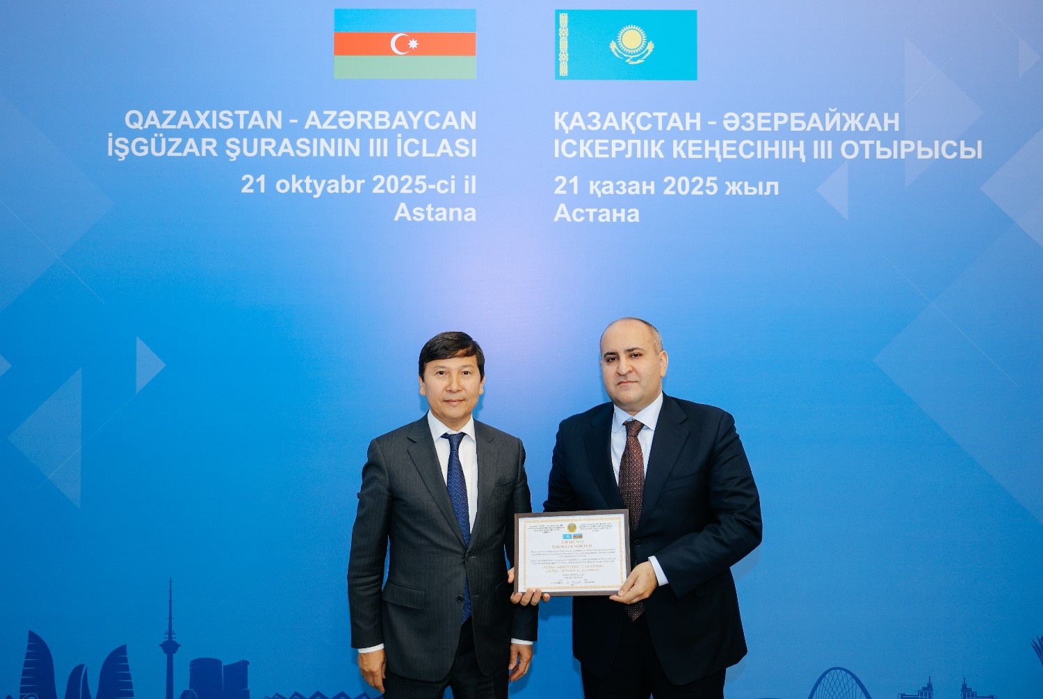 Tədbirdə Azərbaycan və Qazaxıstanın dövlət qurumları və şirkətləri arasında su ehtiyatlarının idarə olunmasının rəqəmsallaşdırılması, sənaye istehsalı, qarşılıqlı investisiyaların təşviqi, şəhər infrastrukturunun inkişafı, Astanada “KOB evi” modelinə əsaslanan mərkəzin yaradılması, ticarət, səhiyyə və təhsil sahələrini əhatə edən sənədlər imzalanıb.
