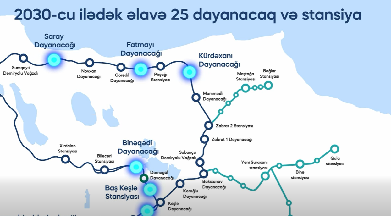 Bakı və ətraf ərazilərdə dəmir yolu şəbəkəsinin genişləndirilməsi istiqamətində işlər davam etdirilir. Dövlət Proqramı çərçivəsində 2030-cu ilədək paytaxt və ətraf yaşayış məntəqələrində ümumilikdə 25 yeni dayanacaq və stansiyanın istifadəyə verilməsi nəzərdə tutulur.