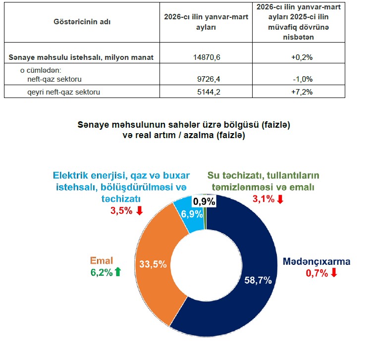 2026-cı ilin yanvar-mart aylarında Azərbaycanın sənaye sektorunda 14,9 milyard manat məbləğində və ya ötən ilin eyni dövrü ilə müqayisədə real ifadədə 0,2 faiz çox sənaye məhsulu istehsal edilib.