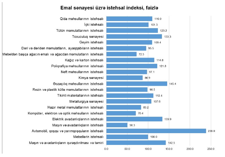 Bildirilib ki, hesabat dövründə emal sənayesində daha çox artım avtomobil, qoşqu və yarımqoşquların istehsalı, əczaçılıq məhsullarının istehsalı, maşın və avadanlıqların quraşdırılması və təmiri işləri, elektrik avadanlıqlarının istehsalı, toxuculuq sənayesi sahələrində olub.