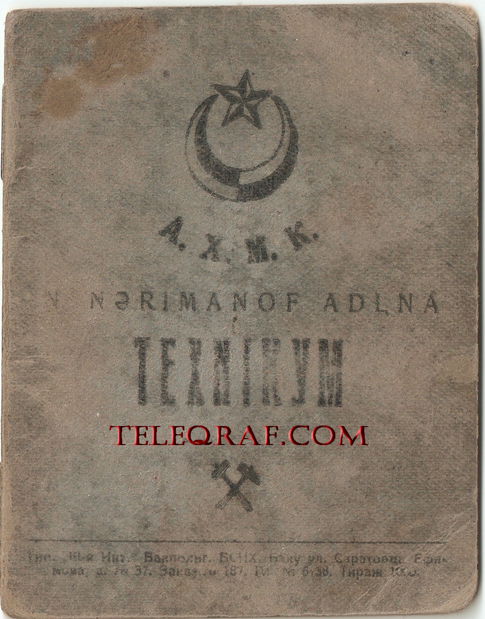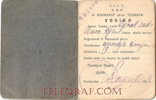 "Kolleksiya" layihəsində təqdim etdiyimiz ikinci sənəd 1929-cu ilə aid tələbə vəsiqəsidir. Üzərində beşguşəli ulduz və çəkic təsviri olan vəsiqədə "A.X.M.K Nərimanof adına Texnikum" ifadəsi yazılıb. Vəsiqənin ikinci səhifəsində isə "A.İ.Ş.C X.M.K Nərimanof adına Texnikum Vəsikə" yazıları qeyd olunub. Yəni Azərbaycan İctimai Şuralar Cümhuriyyəti Xalq Maarif Komissarlığı.