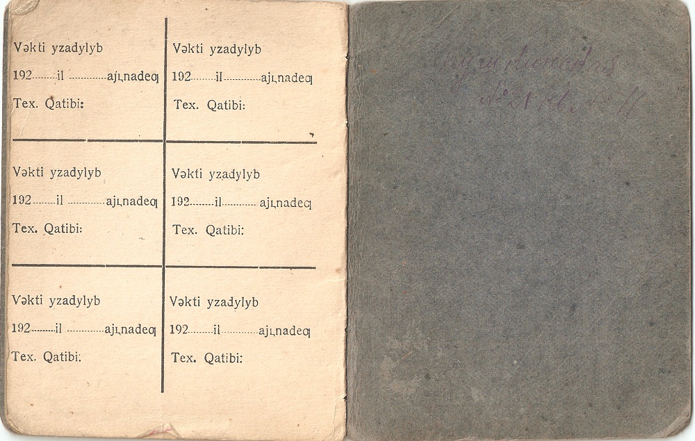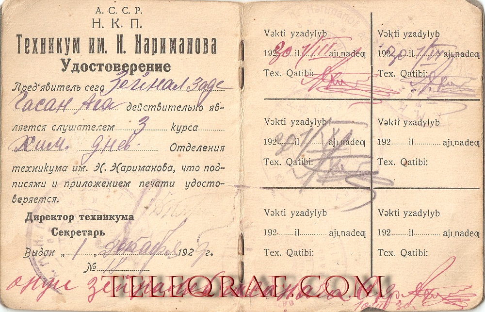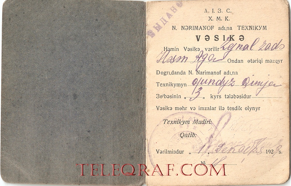 Vəsiqə Həsənağa Zeynalzadə adlı bir şəxsə 1929-cu ilin 1 dekabrında verilib. Həmin tarixdə bu tələbə kimya şöbəsinin gündüz növbəsində üçüncü kursda oxuyub. Vəsiqənin digər səhifəsində isə eyni bilgilər rus dilində verilib.