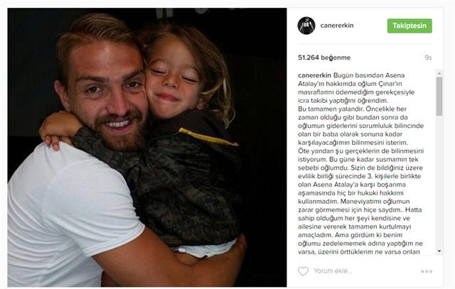 Axşam.az-ın Türkiyə mətbuatına istinadən məlumatına görə, bir neçə gün əvvəl Asena Caneri məhkəməyə verərək oğlunun alimentini vermədiyini bildirmişdi. Bu iddialar qarşısında səssiz qalmayan futbolçu Asenaya sərt sözlər ünvanlayıb. O, evlilikləri zamanı Asenanın başqa kişilərlə görüşdüyünü, amam oğluna görə məhkəmədə bunları demədiyini bildirib: "Kədərlənərək etiraf edirəm ki, oğlum Çinarın anası ağlı kəm, öz mənfəətlərini ön planda tutan və bunun üçün sərhəd tanımayan və analıq şüurundan tamamilə uzaqdır... Oğlumun alimentini ödəmədiyim barədə xəbərlər tamam yalandır. Oğlumun məsrəflərinin sona qədər qarşılayacağam.