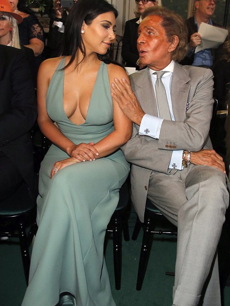 Sinə dekolteli firuzə rəngli paltarı ilə bütün nəzərləri üzərinə cəmləyən Kim dəfiləni Valentino Klemente və Ludovico Qaravani ilə birlikdə izləyib.