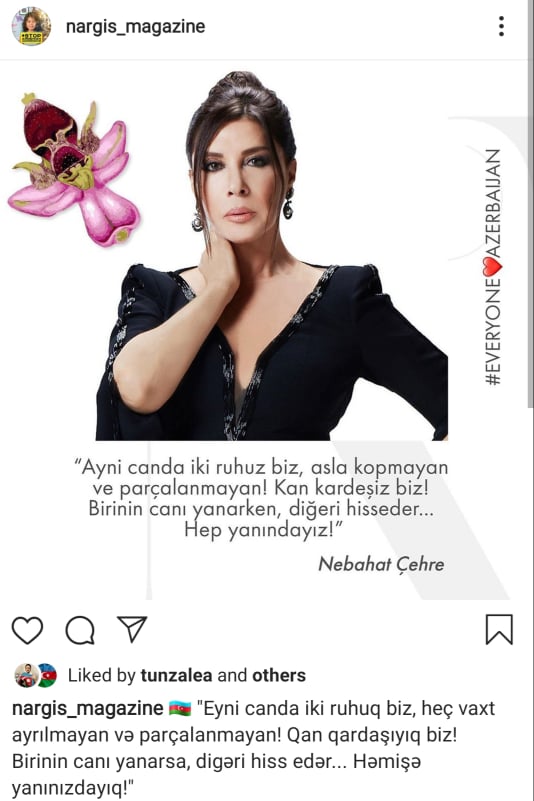 Teleqraf.com xəbər verir ki, Nebahat Çehrenin Azərbaycana müraciəti “Nargis Magazine” jurnalının İnstaqram hesabında paylaşılıb.