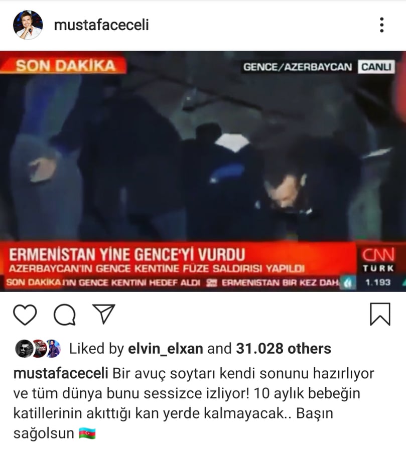 Teleqraf.com xəbər verir ki, Mustafa Ceceli İnstaqramda ermənilərin Gəncəni atəşə tutmasını və dinc əhalini hədəfə almasını pisləyib: