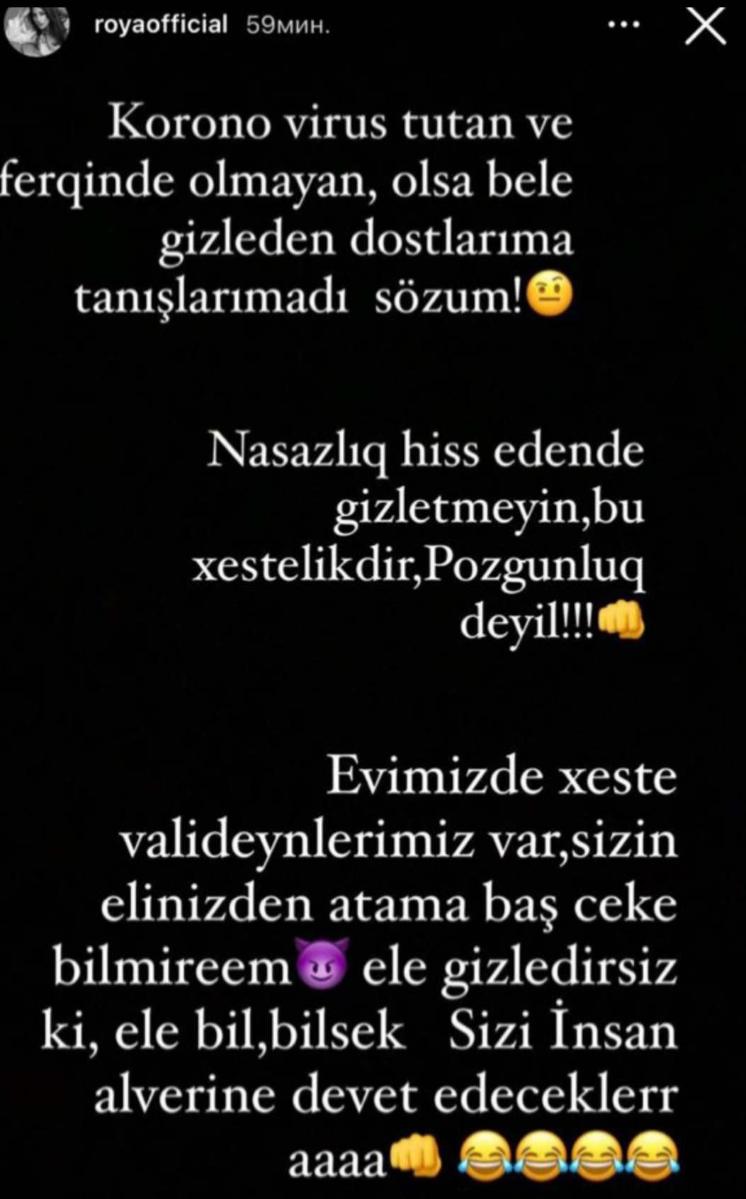 Teleqraf.com xəbər verir ki, Röya Ayxan İnstaqramda hekayə bölümündə bəzi dostlarının virusa yoluxduğunu gizlətdiyini iddia edib: