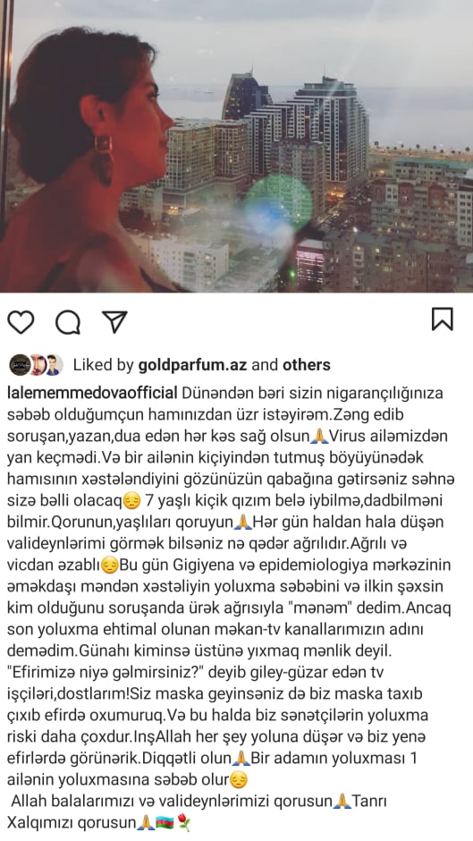"Virus ailəmizdən yan keçmədi. Və bir ailənin kiçiyindən tutmuş böyüyünə hamının xəstələndiyini gözünüzün qabağına gətirsəniz, səhnə sizə bəlli olacaq. Yeddi yaşlı kiçik qızım belə iybilmə, dadbilməni itirib. Qorunun, yaşlıları qoruyun. Hər gün haldan-hala düşən valideynlərimi görmək çox ağırdır. Ağrılı və vicdan əzablı..."