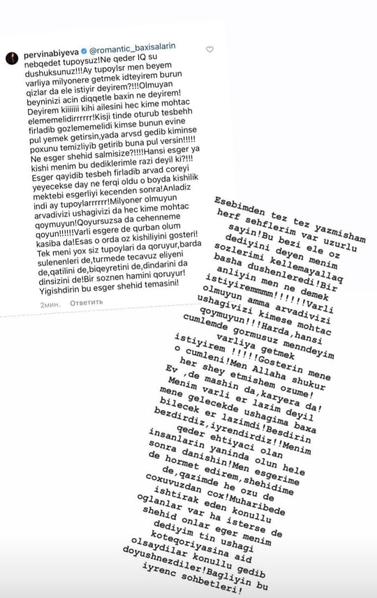 Harada görmüsünüz, mən deyim k, varlıya ərə getmək istəyirəm. O cümləni mənə göstərin. Mən Allaha şükür, özüm üçün hər şey etmişəm, ev, avtomobil, karyera... Mənə varlı ər yox, uşağıma baxacaq ər lazımdır. Bəsdirin, bezdirdiniz, iyrəndirdiniz. Bu iyrənc söhbətləri bağlayın".
