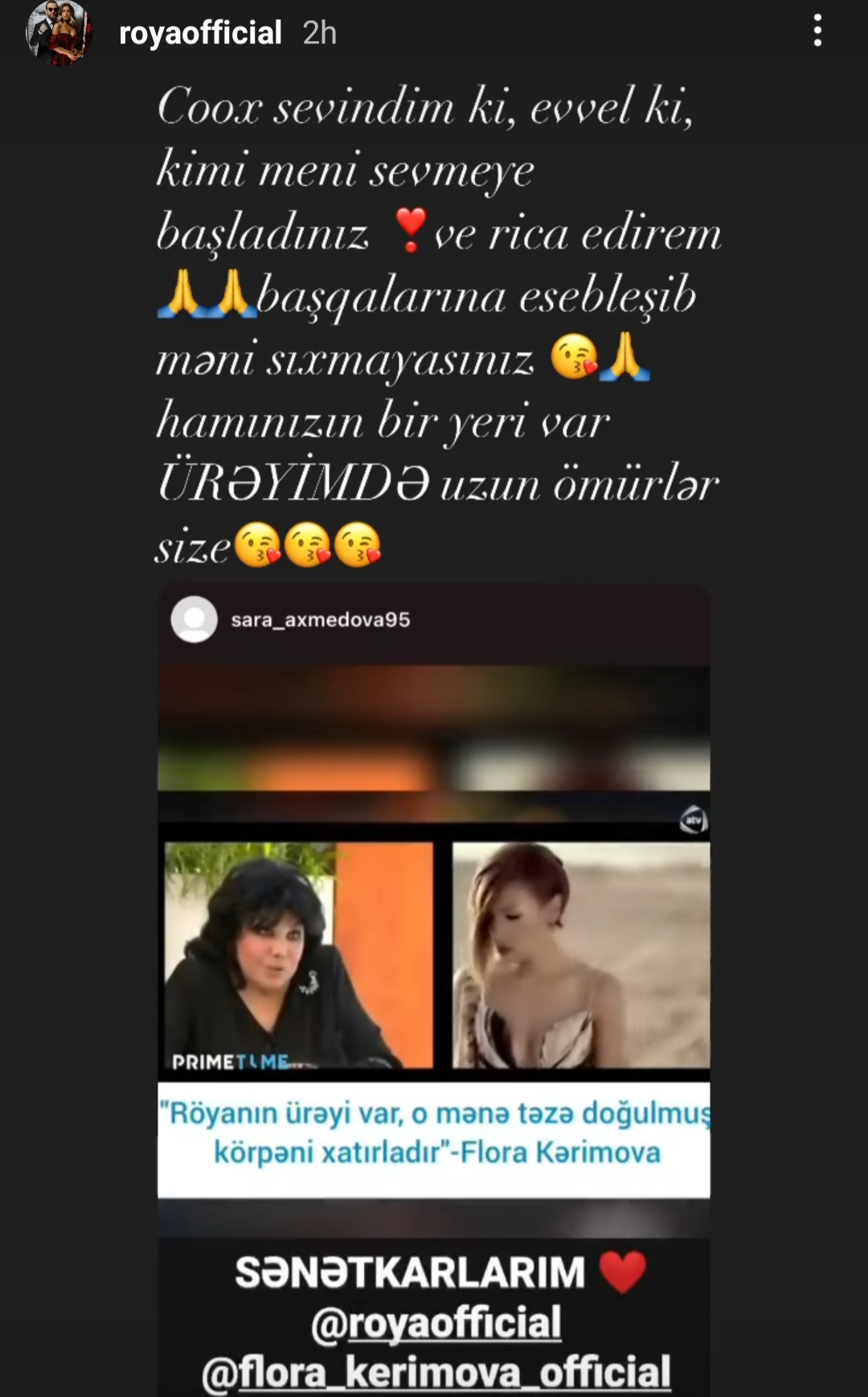 Teleqraf.com xəbər verir ki, Röya Ayxan İnstaqramda hekayə bölümündə "Çox sevindim ki, əvvəlki kimi məni sevməyə başladınız. Və rica edirəm ki, başqasına əsəbləşib, məni sıxmayasınız. Hamımızın ürəyində bir yeri var. Sizə uzun ömürlər..."-deyə, bildirib.