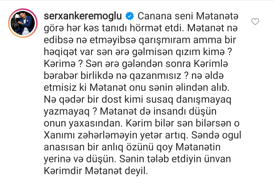 Teleqraf.com xəbər verir ki, Sərxan Kərəmoğlu sosial şəbəkədə Canananın ünvanına bu sözləri deyib: