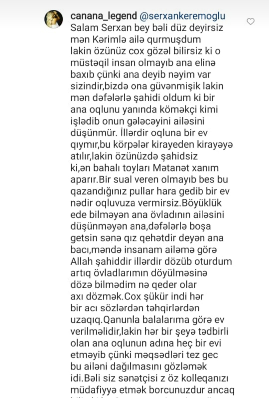 Teleqraf.com-un xəbərinə görə, Canana sosial şəbəkədə aparıcının ünvanına bu sözləri yazıb: "Sərxan bəy, düz deyirsiniz, Kərim bəylə ailə qurmuşdum. Lakin özünüz çox gözəl bilirsiniz ki, o, müstəqil insan olmayıb. Ana əlinə baxıb. Çünki ana deyib, nəyim var sizindir. Biz də ona güvənmişik.