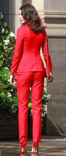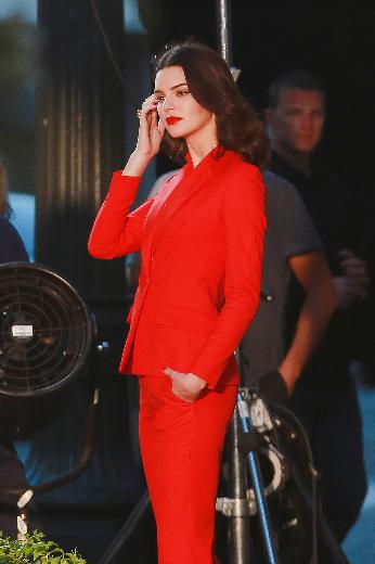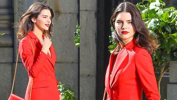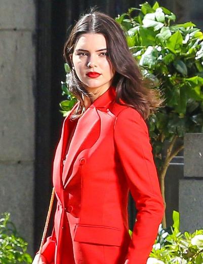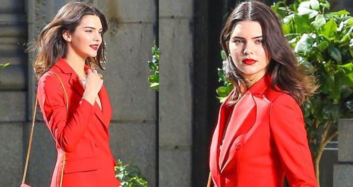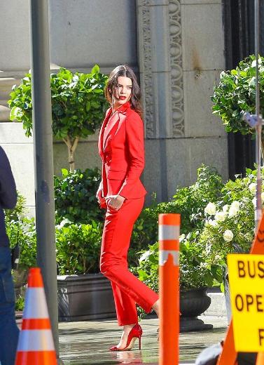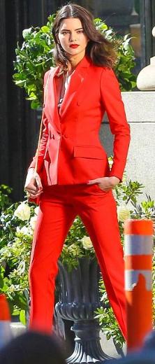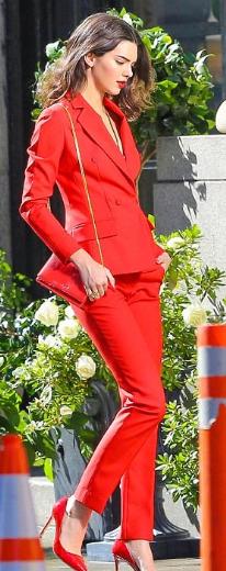Qırmızı şalvar və pencək dəsti geyinən Cenner, eyni rəng hündür dabanlı ayaqqabıları ilə göz qamaşdırıb.
