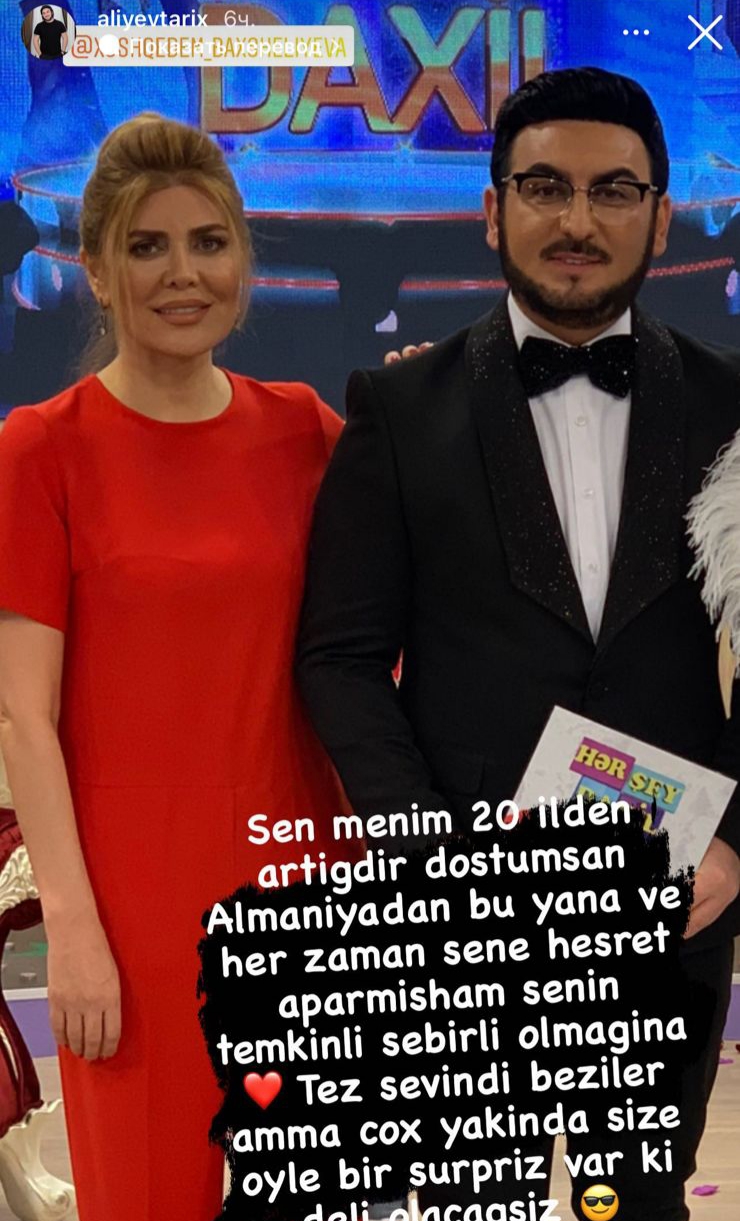 Teleqraf.com xəbər verir ki, Tarix Əliyev İnstaqramda hekayə bölümündə Xoşqədəm Hidayətqızı ilə fotosunu paylaşaraq "Sən mənim 20 ildən artıq dostumsan, hər zaman təmkinli, səbrli olmağına həsəd aparmışam. Bəziləri tez sevindi, amma çox yaxında sizə elə bir sürpriz var ki, dəli olacaqsınız", - deyə qeyd edib.