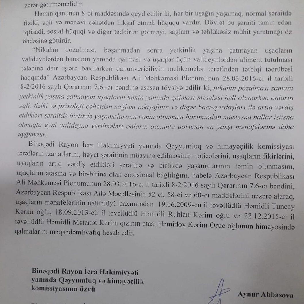 Məhkəmənin qəyyumluq və himayəçilik şöbəsinin verdiyi rəyi paylaşaraq bu sözləri qeyd edib: