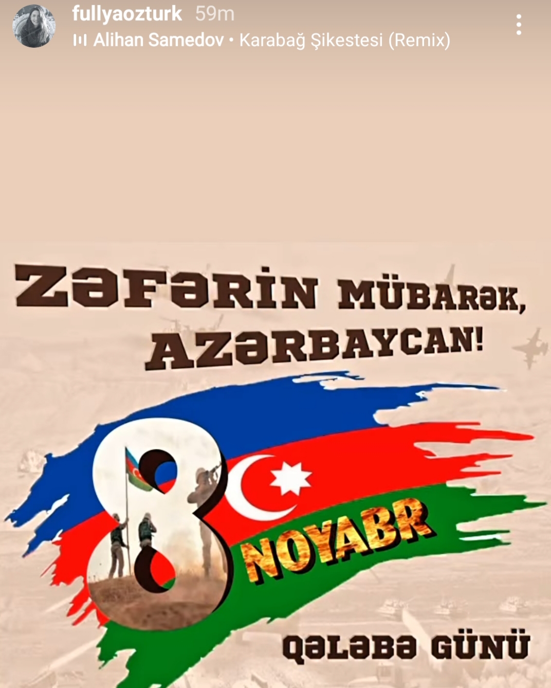 Teleqraf.com xəbər verir ki, Fulya Öztürk İnstaqramda hekayə bölümündə "Zəfərin mübarək, Azərbaycan! 8 noyabr qələbə günü", - deyə qeyd edib.