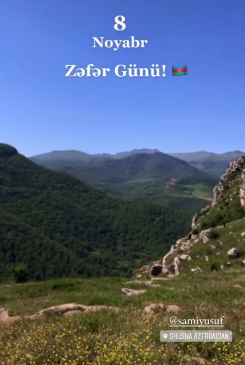 Teleqraf.com xəbər verir ki, Sami Yusuf İnstaqramda hekayə bölümündə Şuşadan görüntülər paylaşaraq "8 noyabr, Zəfər Günü", - deyə qeyd edib.