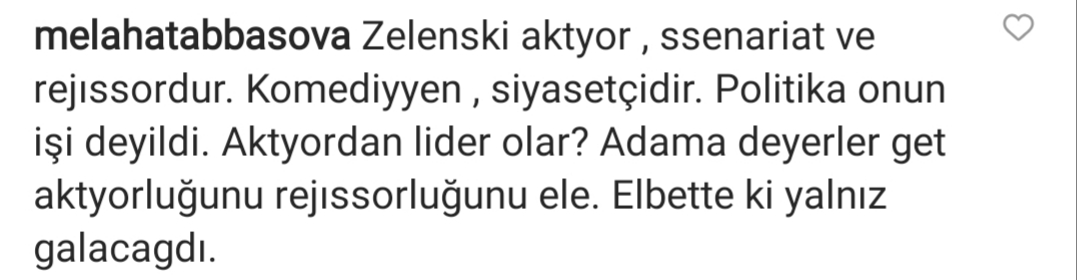 "Volodimir Zelenski aktyor, ssenarist və rejissordur. Siyasət onun işi deyildi. Komediya aktyoru siyasətçidir. Siyasət onun işi deyildi. Aktyordan lider olar?! Adama deyərlər ki, get aktyorluğunu et. Əlbəttə ki, müharibədə yalnız qalacaqdı".