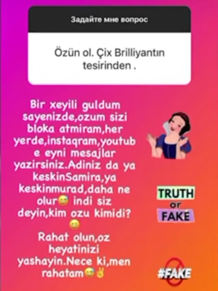 Əməkdar artist İnstaqramda hekayə bölümündə izləyicini saxta profildən yazmaqda ittiham edib: "Sayənizdə bir xeyli güldüm, özüm sizi bloka atmıram. Hər yerdə, İnstaqramda, "Yutub"da eyni mesajları yazırsınız. Adınız da gah Samirə, gah Murad olur. İndi deyin, kim özü kimidi? Rahat olun, öz həyatınızı yaşayın. Necə ki, mən rahatam".