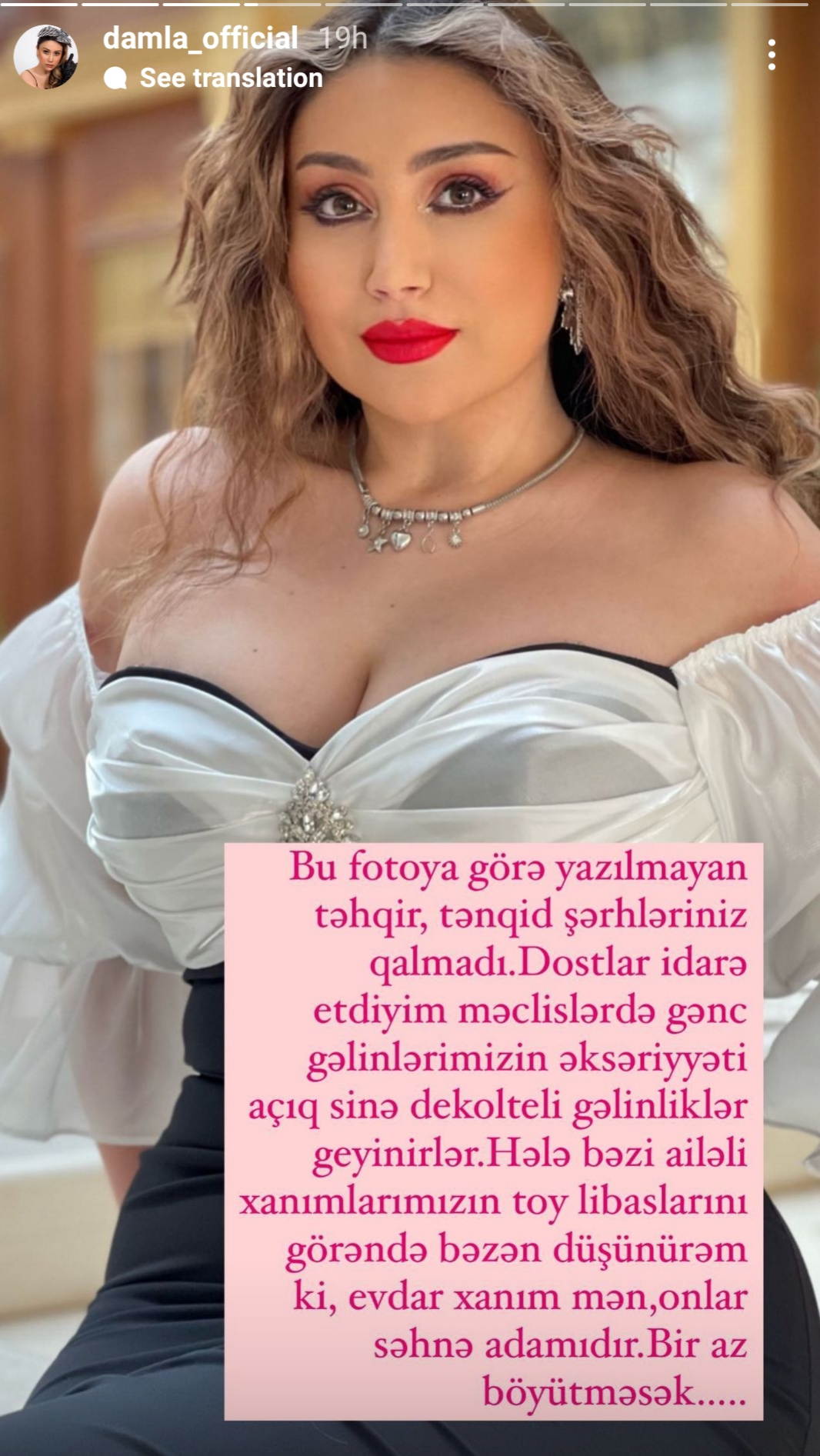 "Bu fotoya görə yazılmayan təhqir, tənqidi şərhləriniz qalmadı. Dostlar, idarə etdiyim məclislərdə gənc gəlinlərimizin əksəriyyəti açıq sinə dekolteli gəlinliklər geyinirlər. Hələ bəzi ailəli xanımlarımızın toy libaslarını görəndə bəzən düşünürəm ki, evdar xanım mən, onlar səhnə adamıdır. Bir az böyütməsək...".