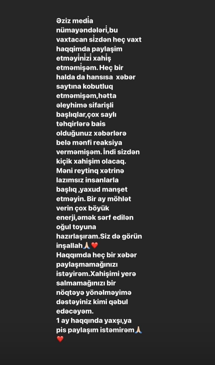 "Əziz media nümayəndələri, bu vaxta qədər heç vaxt haqqımda paylaşım etməyinizi istəməmişəm. Heç bir halda da hansısa sayta qarşı kobudluq etməmişəm. İndi sizdən kiçik xahişim olacaq. Bir ay möhlət verin, çox böyük enerji, əmək sərf edilən oğul toyuna hazırlaşıram. Haqqımda heç bir xəbər paylaşmayacağınızı istəyirəm".
