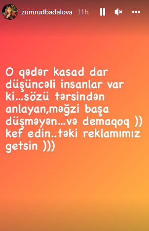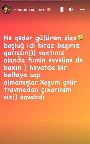 Aparıcı isə tənqidi fikirlərə “O qədər kasad, dar düşüncəli insanlar var ki, sözü tərsindən anlayan, məğzi başa düşməyən və demaqoq. Kef edin, təki reklamınız getsin. Sizə nə qədər gülürəm. Boşluq idi, bir az başınız qarışsın. Vaxtınız olanda filmin əvvəlinə də baxın, həyatda bir baltaya sap olmamışlar. Xoşum gəlir, travmadan çıxarıram sizi, savabdır”, - deyə cavab verib.