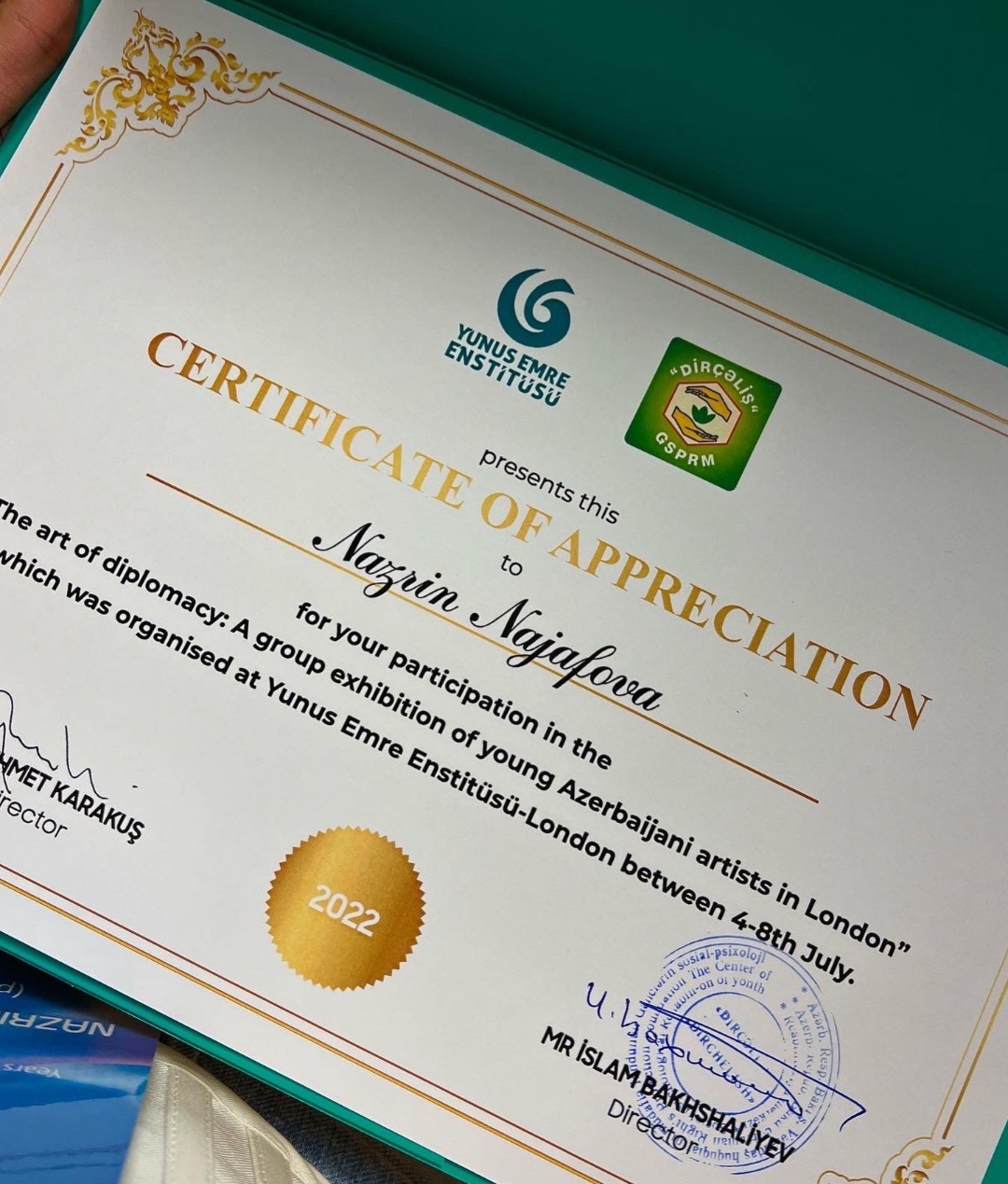 Onun sözlərinə görə, Londonda Yunus Əmrə İnstitutunda Azərbaycan gənc rəssamlarının rəsm sərgisi keçirilib: "Sərgidə 20-dən çox rəssam iştirak edib. Sərgi iyulun 8-dək davam edəcək. Mənim üç əl işim sərgidə nümayiş olunub, Şuşa, Laçın, Xudafərin körpüsü...".