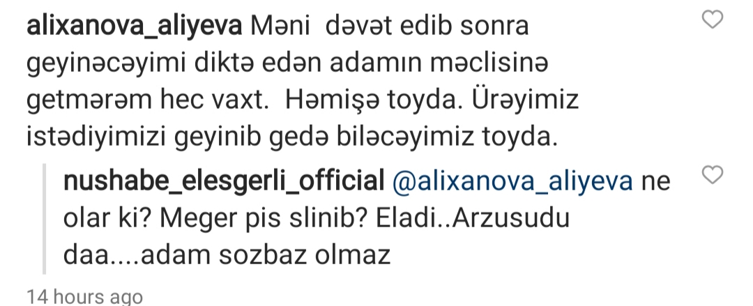 Teleqraf.com xəbər verir ki, məclisdə qonaq qismində iştirak edən əməkdar artist Nüşabə Ələsgərli İnstaqram hesabında foto paylaşıb. Bir şəbəkə izləyicisi ifaçının paylaşımına belə rəy yazıb: "Heç vaxt məni məclisinə dəvət edib, nə geyinəcəyimi diktə edən adamın tədbirinə getmərəm. Ürəyimiz istədiyini geyinib, gedə biləcəyimiz toyda...".