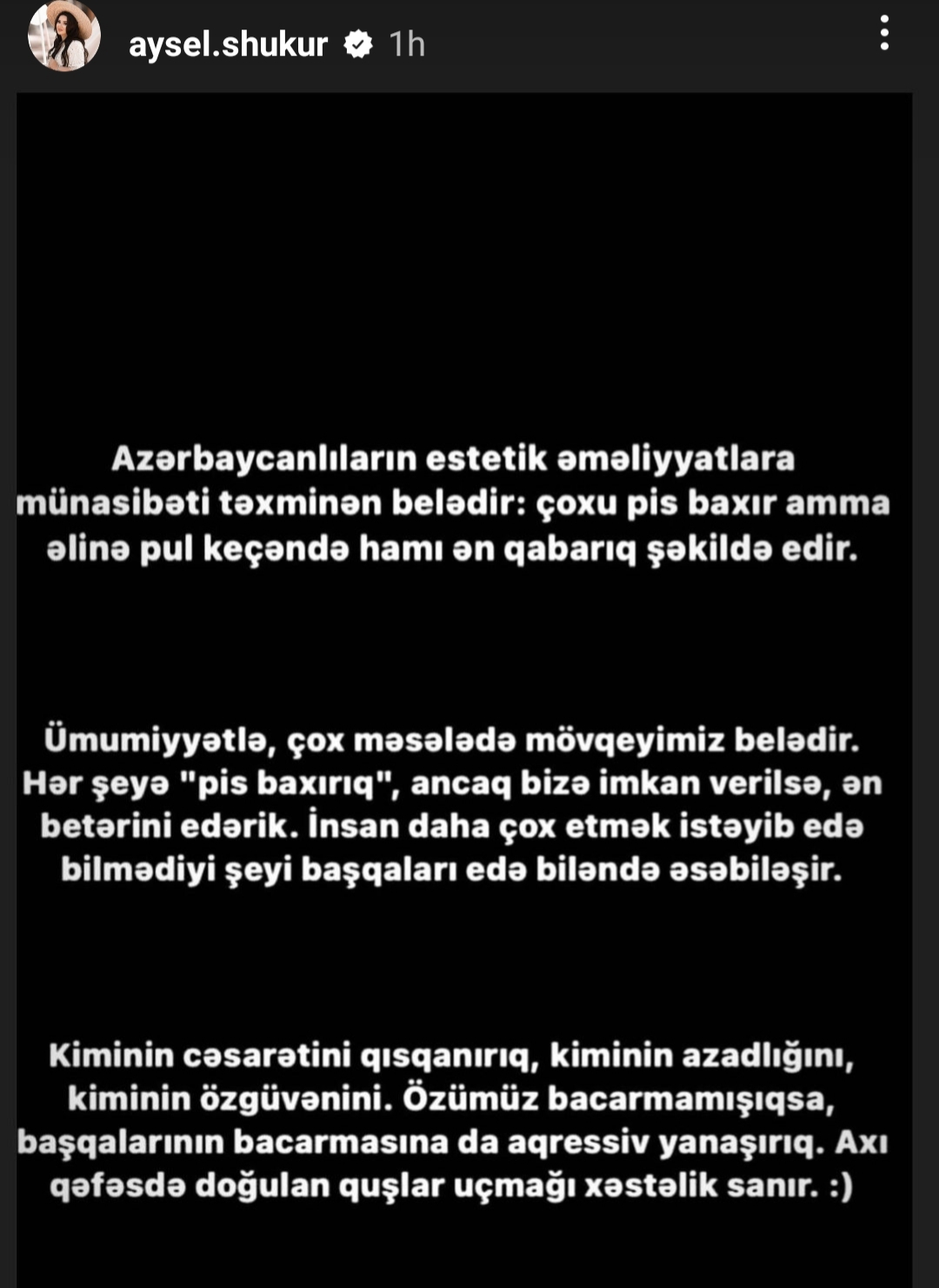 Teleqraf.com xəbər verir ki, Aysel Şükürova İnstaqramın hekayə bölümündə estetik əməliyyatlara qarşı çıxanları tənqid edib: