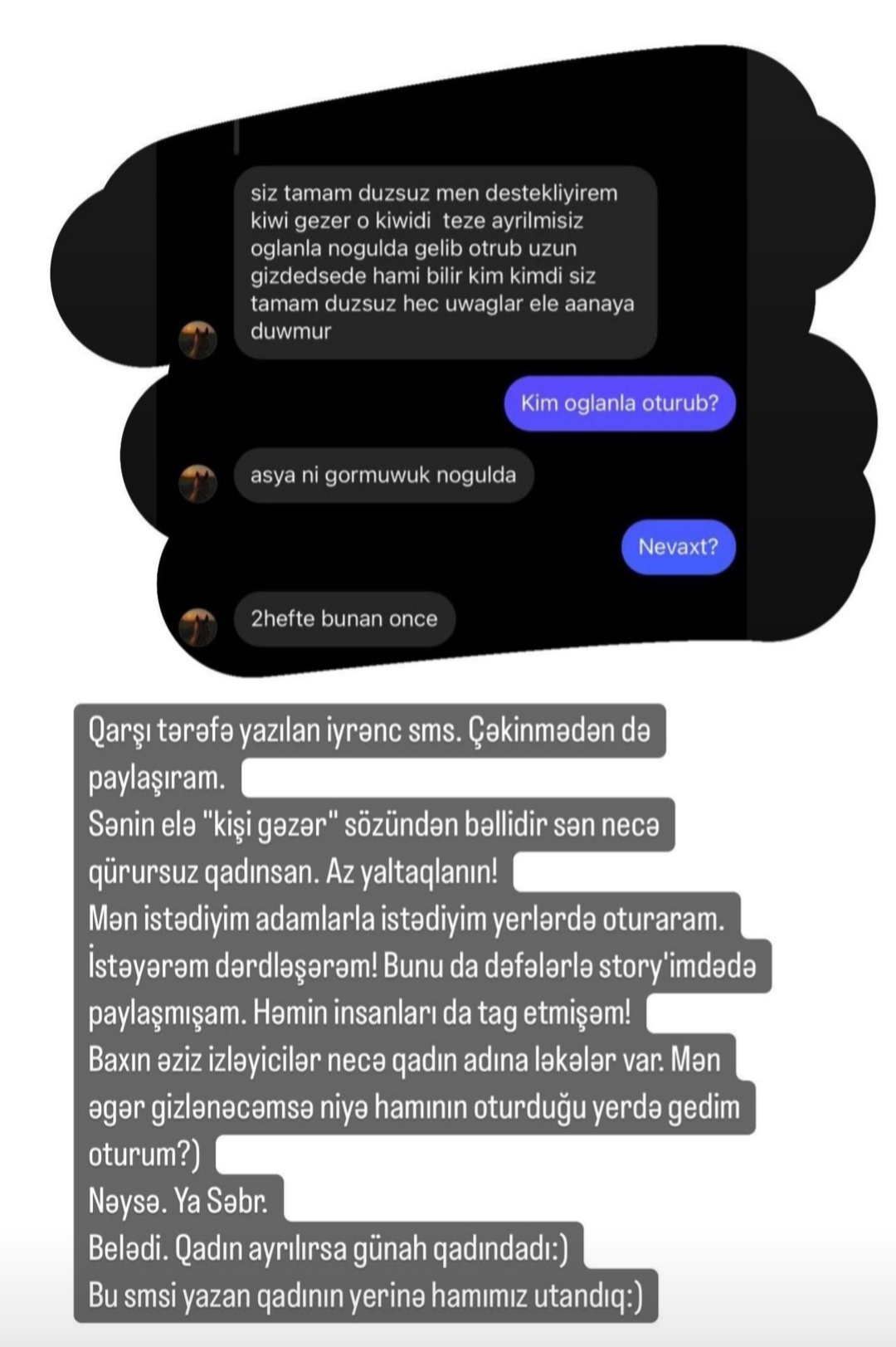 "Qarşı tərəfə yazılan iyrənc mesaj... Çəkinmədən də paylaşıram. Mən istədiyim yerdə istədiyim adamla oturaram, istəyərəm dərdləşərəm. Bunu da dəfələrlə hekayə bölümündə paylaşmışam. Mən əgər gizlənəcəmsə, niyə hamının oturduğu yerdə oturum.