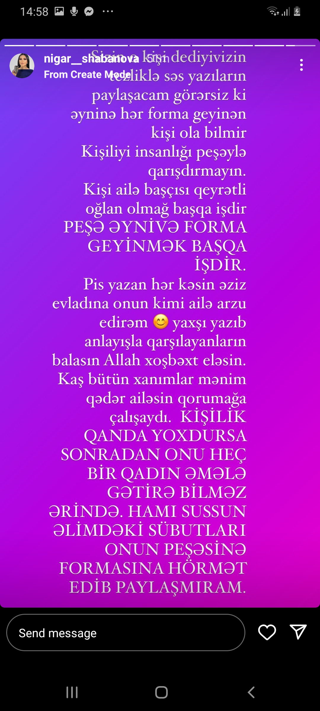Kaş bütün xanımlar mənim qədər ailəsini qorumağa çalışaydı. Kişilik qanda yoxdursa, sonradan heç bir qadın onu əmələ gətirə bilməz ərinsə. Hamı sussun! Əlimdəki sübutları onun peşəsinə, formasına hörmət edib paylaşmıram".