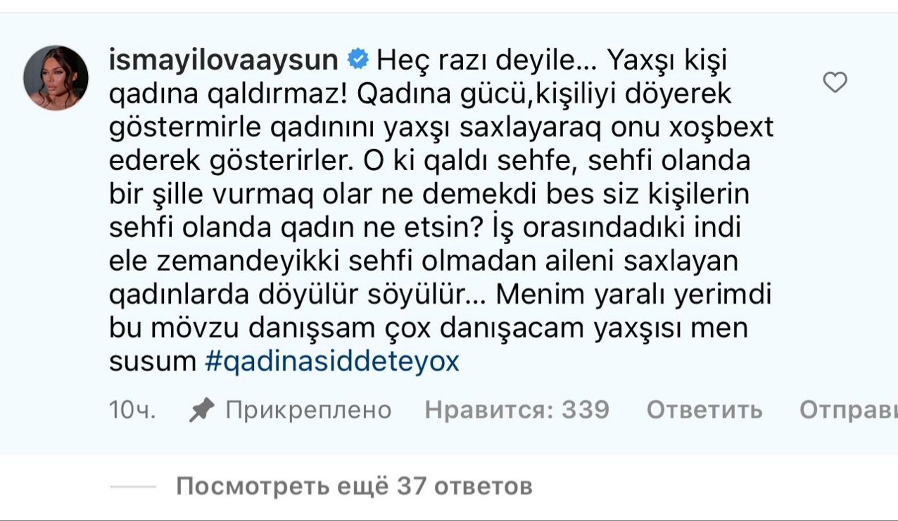 Teleqraf.com xəbər verir ki, Aysun İsmayılova bu sözləri yazıb: "Yaxşı kişi qadına əl qaldırmaz. Qadına gücü, kişiliyi döyərək göstərmirlər, qadını yaxşı saxlamaqla, onu xoşbəxt etməklə göstərirlər. O ki qaldı səhvə, "səhvi olanda bir şillə vurmaq olar" nə deməkdir?! Bəs, siz kişilərin səhvi olanda qadın nə etsin? İş orasındadır ki, indi elə zəmanədəyik, səhvi olmadan ailəni saxlayan qadınlar da döyülüb-söyülür. Bu mövzu mənim yaralı yerimdir, danışsam çox danışacam. Yaxşısı budur susum. Qadına şiddətə yox!"