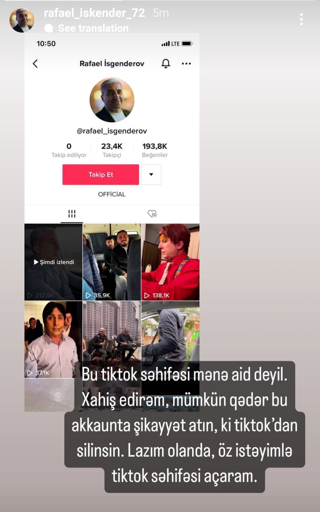 "TikTok" səhifəsi mənə aid deyil. Xahiş edirəm, mümkün qədər akkaunta şikayət atın ki, "TikTok"dan silinsin. Lazım olanda öz istəyimlə səhifə açaram".