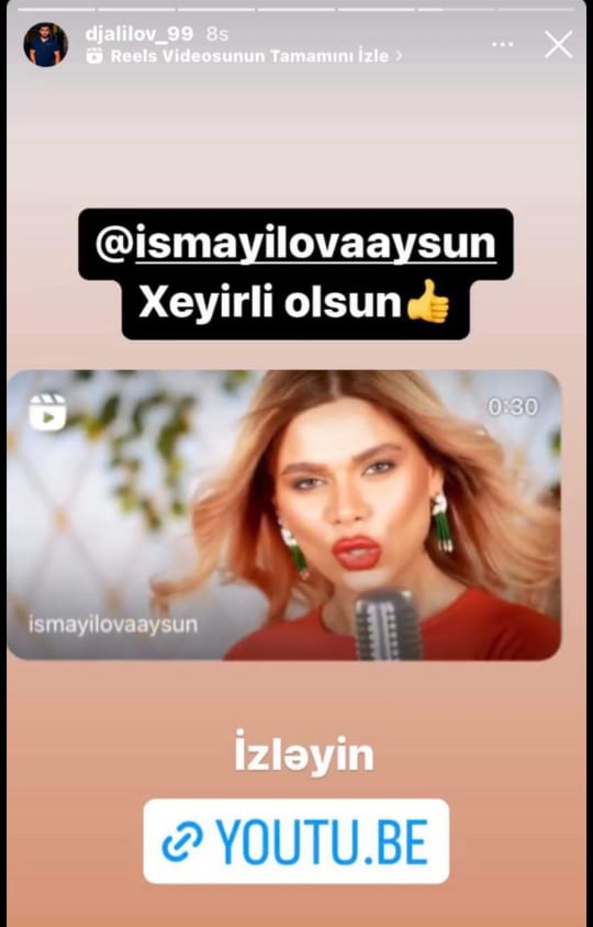 Teleqraf.com xəbər verir ki, Eşqin Cəlilov İnstaqramda hekayə bölümündə Aysun İsmayılovanın “Popuri” mahnısına həsr olunmuş klipi paylaşaraq "Xeyirli olsun",- deyə qeyd edib.