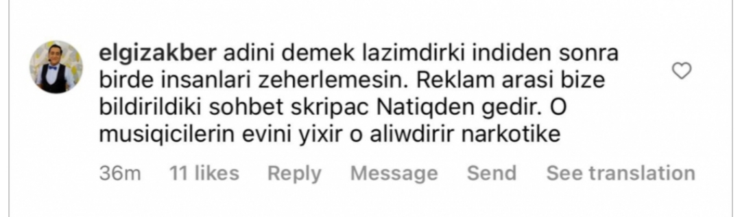"Adını demək lazımdır ki, bir daha insanları zəhərləməsin. Reklam arası bizə bildirildi ki, söhbət skripka ifaçısı Natiqdən gedir (Natiq Nuriyev - red.) O, musiqiçilərin evini yıxır, onları narkotikə alışdırır".