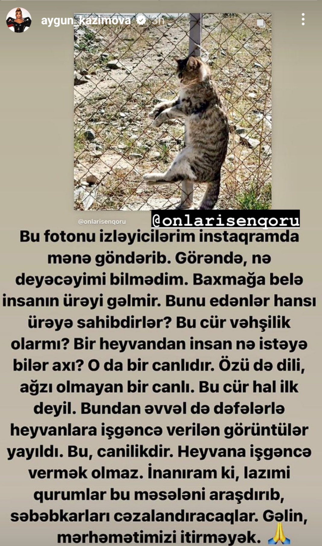 Teleqraf.com xəbər verir ki, o, İnstaqramda işgəncə verilən pişiyin fotosunu paylaşaraq bu hadisəni törədən şəxsə cəza verilməsini istəyib: "Bu fotonu izləyicilərim instaqramda mənə göndərib. Görəndə nə deyəcəyimi bilmədim. Baxmağa belə insanın ürəyi gəlmir. Bunu edənlər hansı ürəyə sahibdirlər? Bu cür vəhşilik olarmı?
