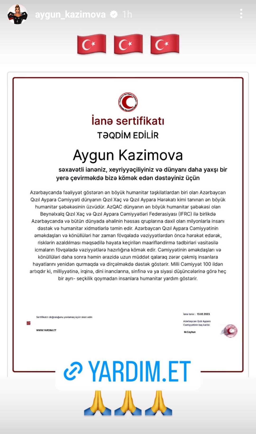 Xalq artisti Azərbaycan Qızıl Aypara Cəmiyyəti tərəfindən təqdim edilən ianə sertifikatını İnstaqramda hekayə bölümündə paylaşıb.