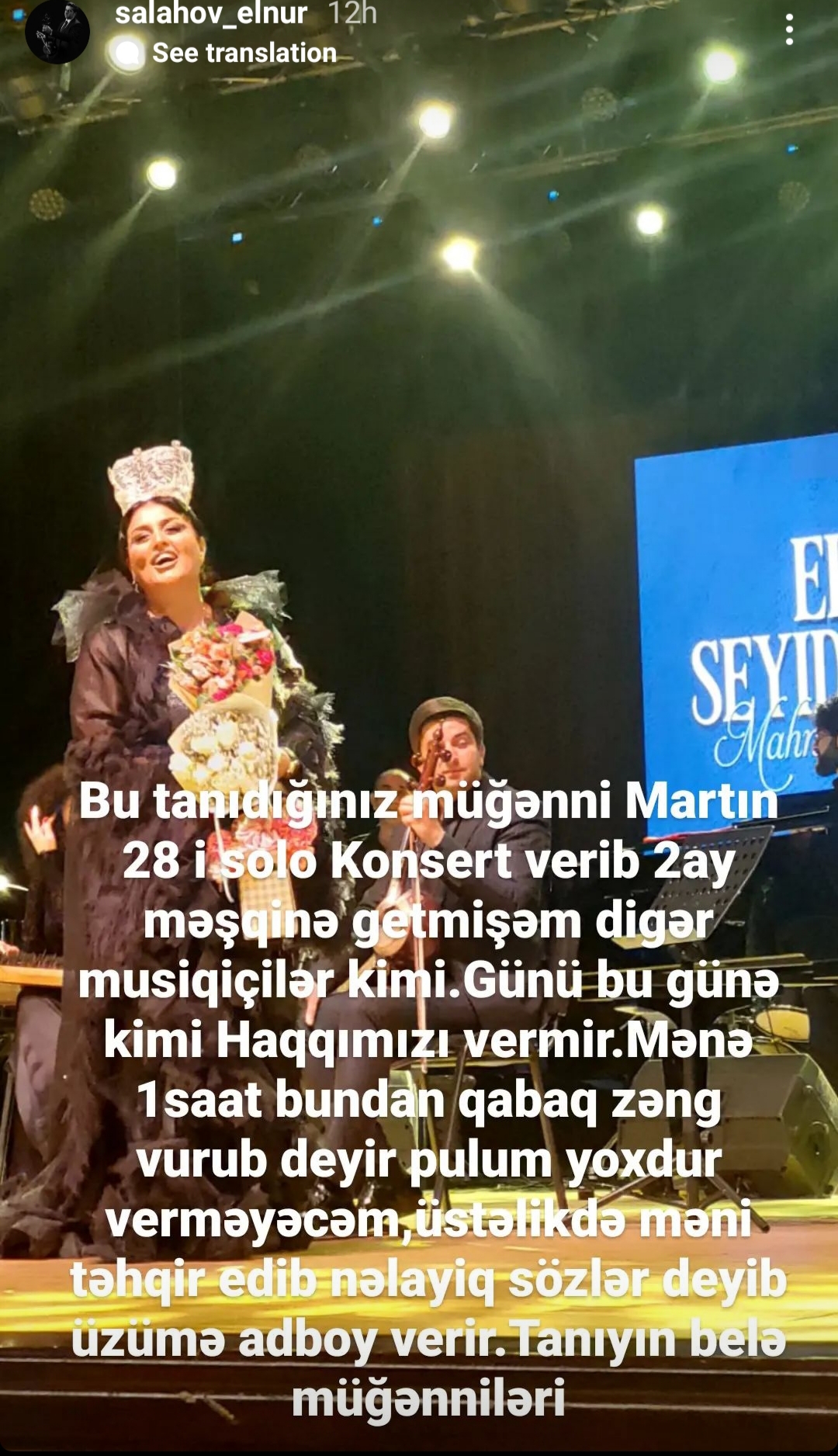Teleqraf.com xəbər verir ki, Elnur Salahov bu haqda sosial media hesabında məlumat yayıb: "Bu tanıdığınız müğənni martın 28-də solo konsert verib, iki ay məşqinə getmişəm digər musiqiçilər kimi. Günü bu günə qədər haqqımızı vermir. Mənə bir saat əvvəl zəng edib deyir ki, pulum yoxdur, verməyəcəm. Üstəlik məni təhqir edib telefonu üzümə söndürür".