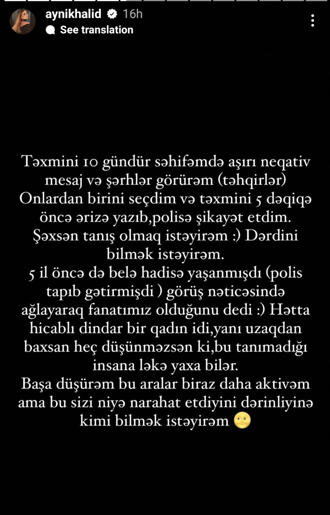 "10 gündür səhifəmdə çox sayda neqativ, tənqidi mesaj və şərhlər görürəm. Onlardan birini seçdim və ərizə yazıb polisə şikayət etdim. Şəxsən tanış olmaq, dərdini bilmək istəyirəm. Beş il öncə də belə bir hadisə yaşanmışdı. Polis həmin şəxsi tapıb gətirmişdi. Görüş nəticəsində ağlayaraq fanatımız olduğunu dedi. Hətta hicablı, dindar bir qadın idi. Başa düşürəm, bu aralar bir az daha aktivəm, amma bunun sizi niyə narahat etdiyinin dərinliyinə kimi bilmək istəyirəm".