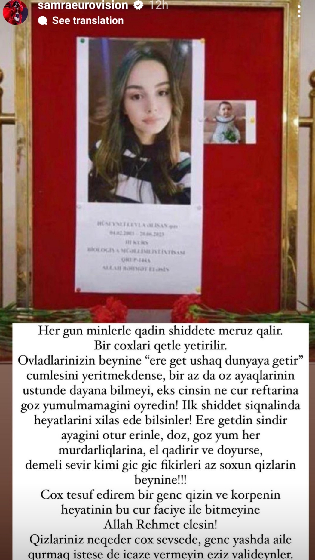 Teleqraf.com xəbər verir ki, Səmra Rəhimli İnstaqramda hekayə bölümündə həyat yoldaşı tərəfindən öldürülən Leyla Hüseynlinin və onun övladının fotosunu paylaşaraq qadınların şiddətə məruz qalmasına sərt reaksiya göstərib: