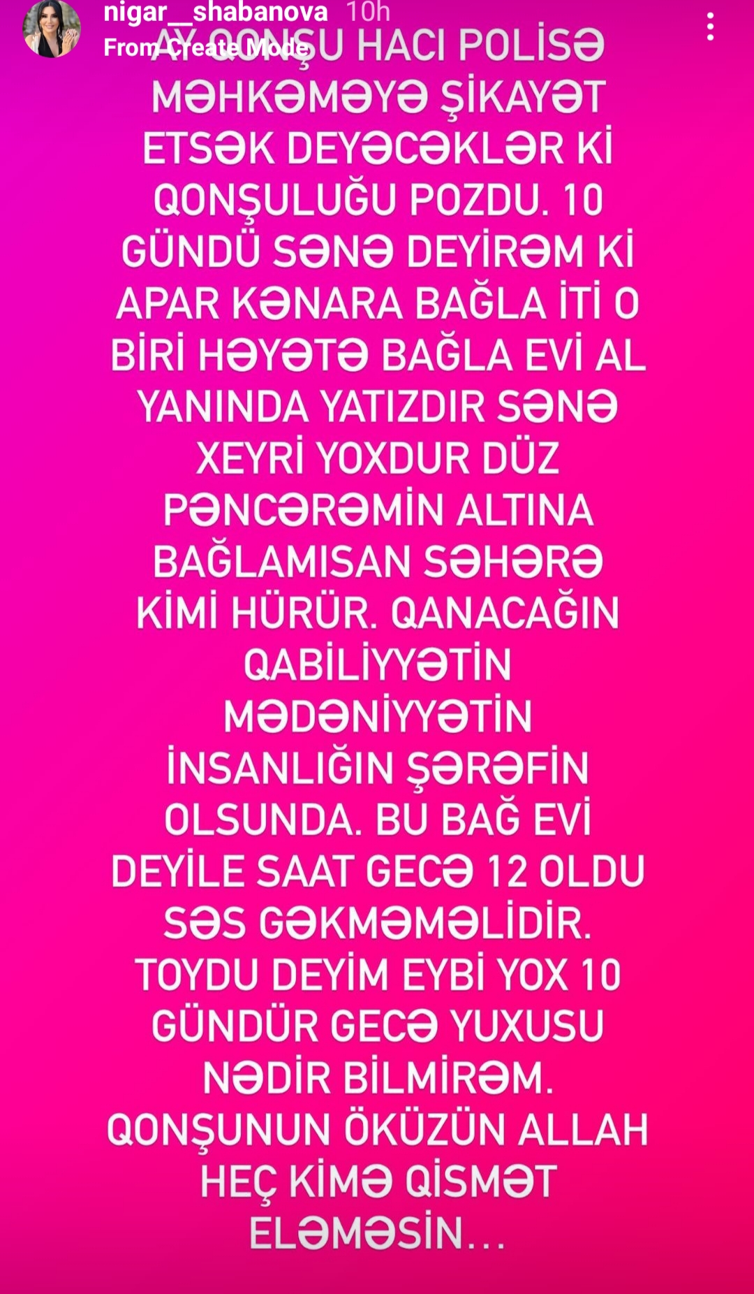 Teleqraf.com xəbər verir ki, Nigar Şabanova sosial media hesabında paylaşım edərək qonşusunu polislə hədələyib:
