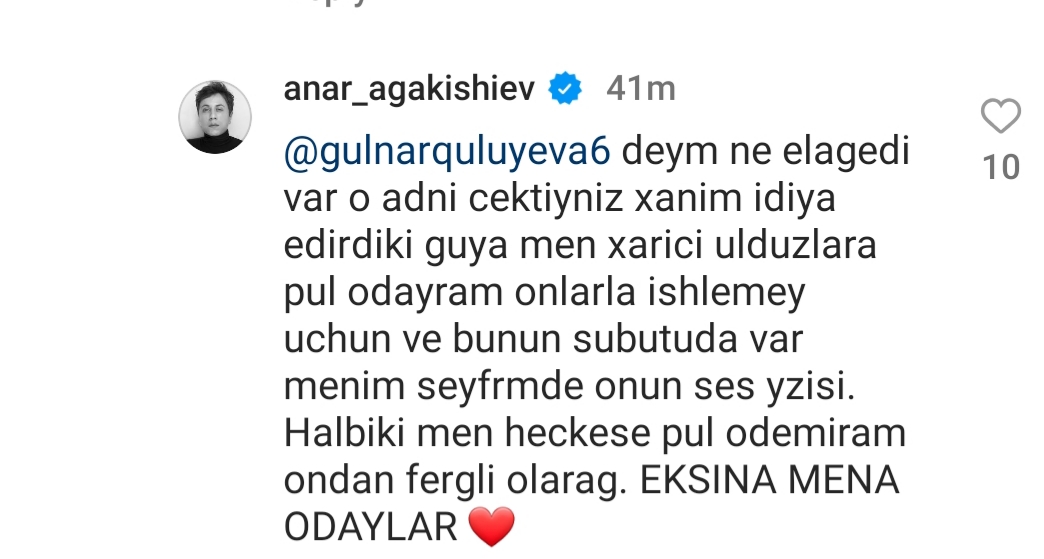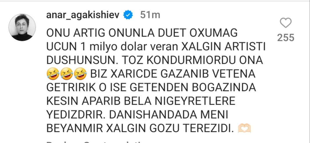 Teleqraf.com xəbər verir ki, Anar Ağakişiyev İnstaqramda şərh bölümündə ad çəkmədən illər öncə Snoop Doggla duet oxuyan xalq artisti Aygün Kazımovanın ünvanına bu sözləri yazıb: "Onu artıq onunla 1 milyon dollar verən xalq artisti düşünsün. Ona toz qondurmurdu. Biz xaricdə qazanıb, vətənə gətiririk. O isə vətəndən, boğazından kəsib aparıb belələrinə yedizdirir. Danışanda da məni bəyənmir. Xalqın gözü tərəzidir".