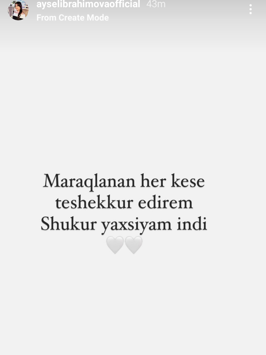 Teleqraf.com xəbər verir ki, Aysel İbrahimova sosial media hesabında paylaşım edərək səhhətinin yaxşı olduğunu bildirib: “Maraqlanan hər kəsə təşəkkür edirəm. İndi şükür, yaxşıyam”.