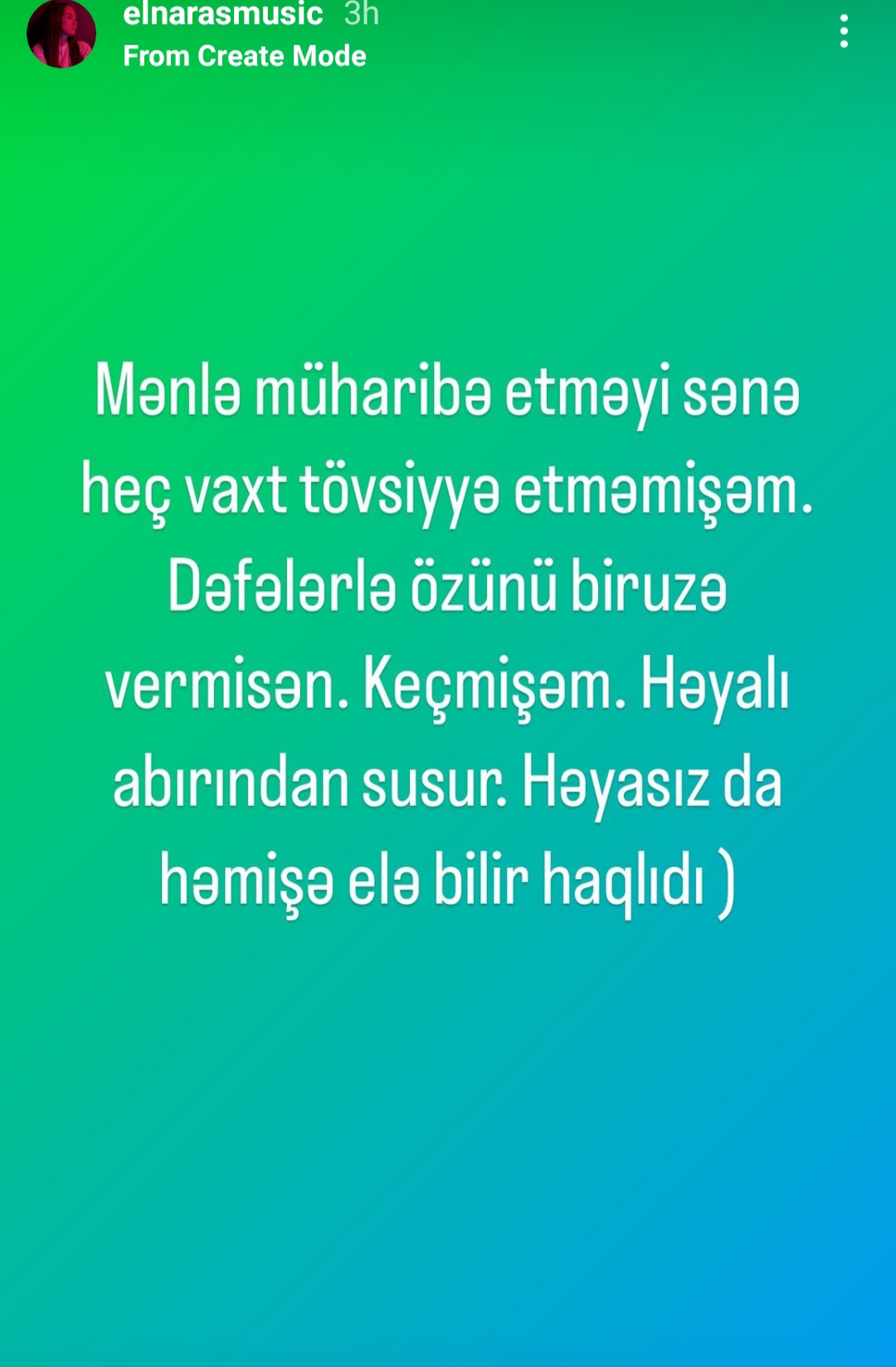 Teleqraf.com xəbər verir ki, müğənni İnstaqramda hekayə bölümündə bu sözləri yazıb: “Mənimlə müharibə etməyi sənə heç zaman tövsiyə etməmişəm. Dəfələrlə özünü büruzə vermisən. Keçmişəm... Həyalı abırından susur. Həyasız da həmişə elə bilir ki, haqlıdır”.