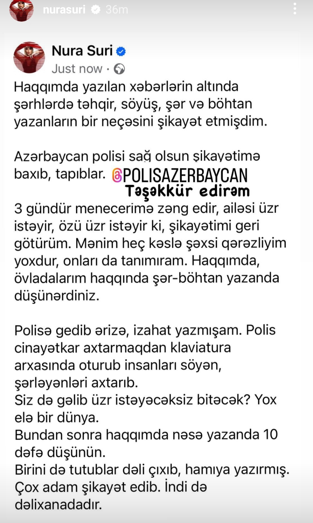 Teleqraf.com xəbər verir ki, bu sözləri müğənni Nura Suri sosial media hesabında yazıb: