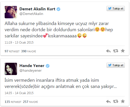 Türkiyəli müğənni Demet Akalının Tvitter hesabında yazdığı "Allaha şükür kimsəyə 300 milyard zərər vermədim" mesajına Hande Yenerdən cavab gəlib.