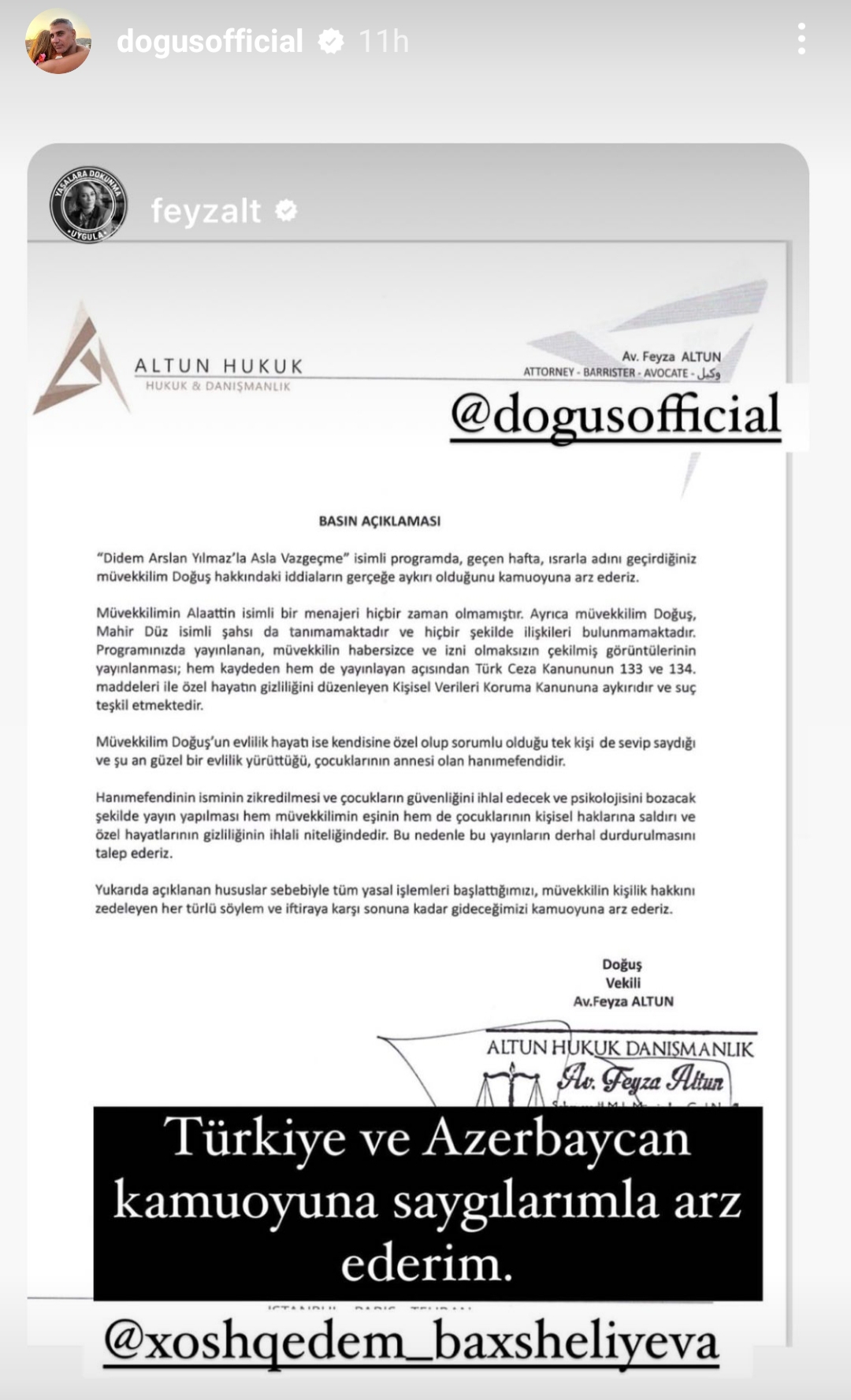 Müğənni Doğuş isə sosial media hesabında vəkili Feyza Altunun mediaya yazılı açıqlamasını təqdim edib.