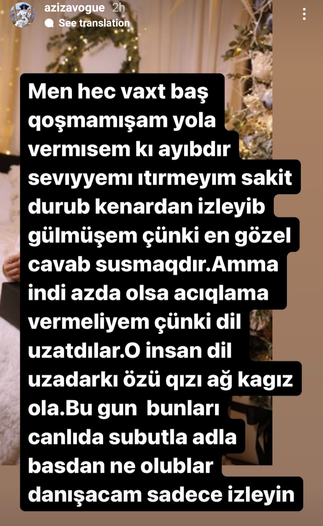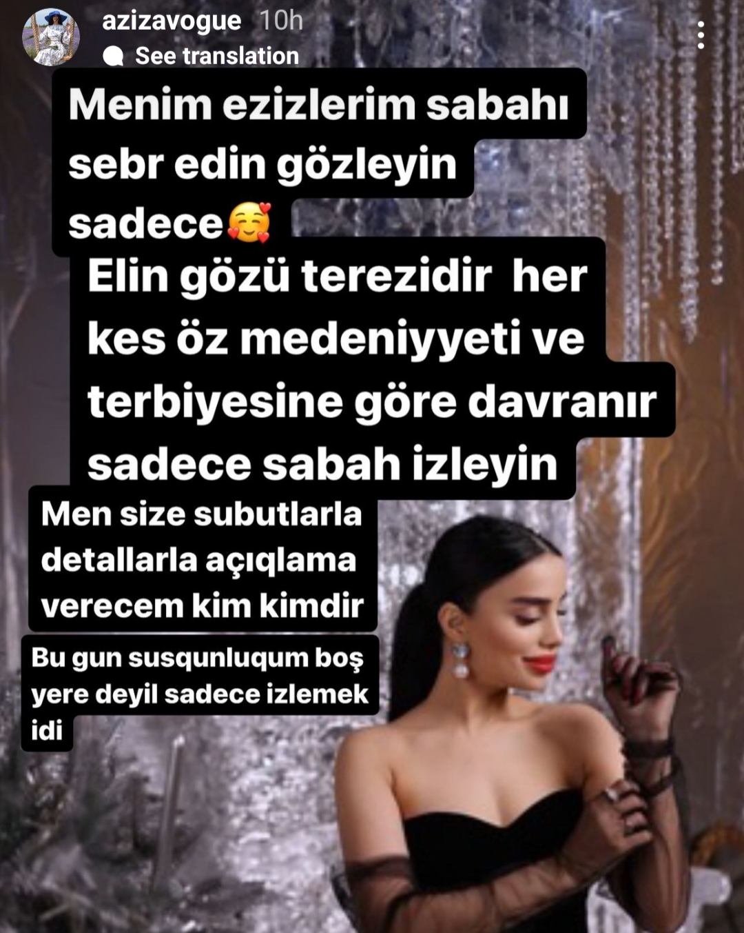 Belə ki, Əzizə Novruzova İnstaqramda hekayə bölümündə bu sözləri yazıb: “Elin gözü tərzidir. Hər kəs öz mədəniyyət və tərbiyəsinə görə davranır. Mən sizə sübut, detallarla açıqlama verəcəm ki, kim kimdir. Bu gün susqunluğum boş yerə deyil, sadəcə izləmək idi. Mən heç vaxt baş qoşmamışam, yola vermişəm ki, ayıbdır. Səviyyəmi itirməyim, sakit durub kənardan izləyib gülmüşəm. Çünki ən gözəl cavab susmaqdır. Amma indi az da olsa açıqlama verməliyəm, çünki dil uzatdılar. O insan dil uzadar ki, özü, qızı ağ kağız olsun. Bunu sizə sosial şəbəkədə canlıda sübutla danışacam”.