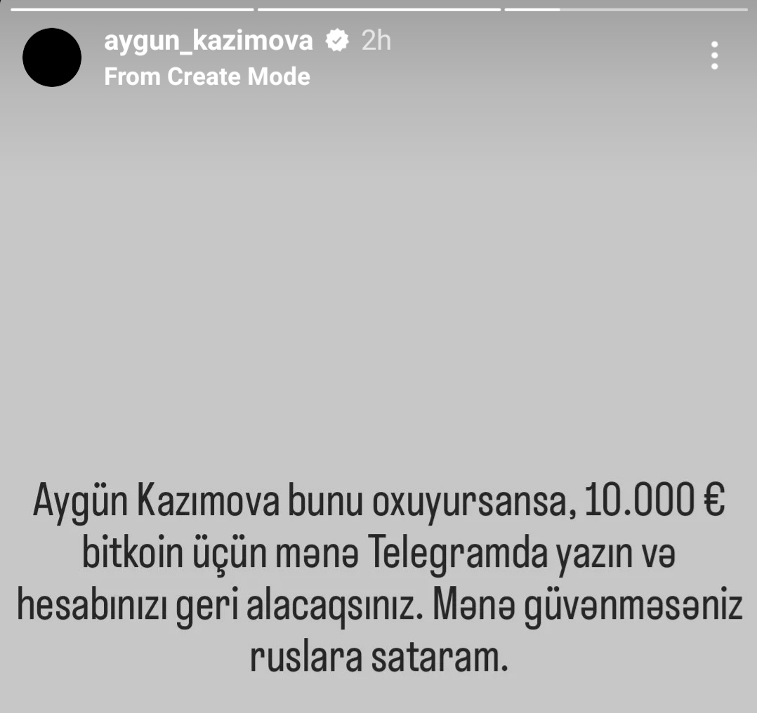 "Aygün Kazımova bunu oxuyursansa, 10.000 avro Bitkoin üçün mənə "Telegram"dan yazın. Və hesabınızı geri alacaqsınız. Mənə güvənməsəniz ruslara sataram".