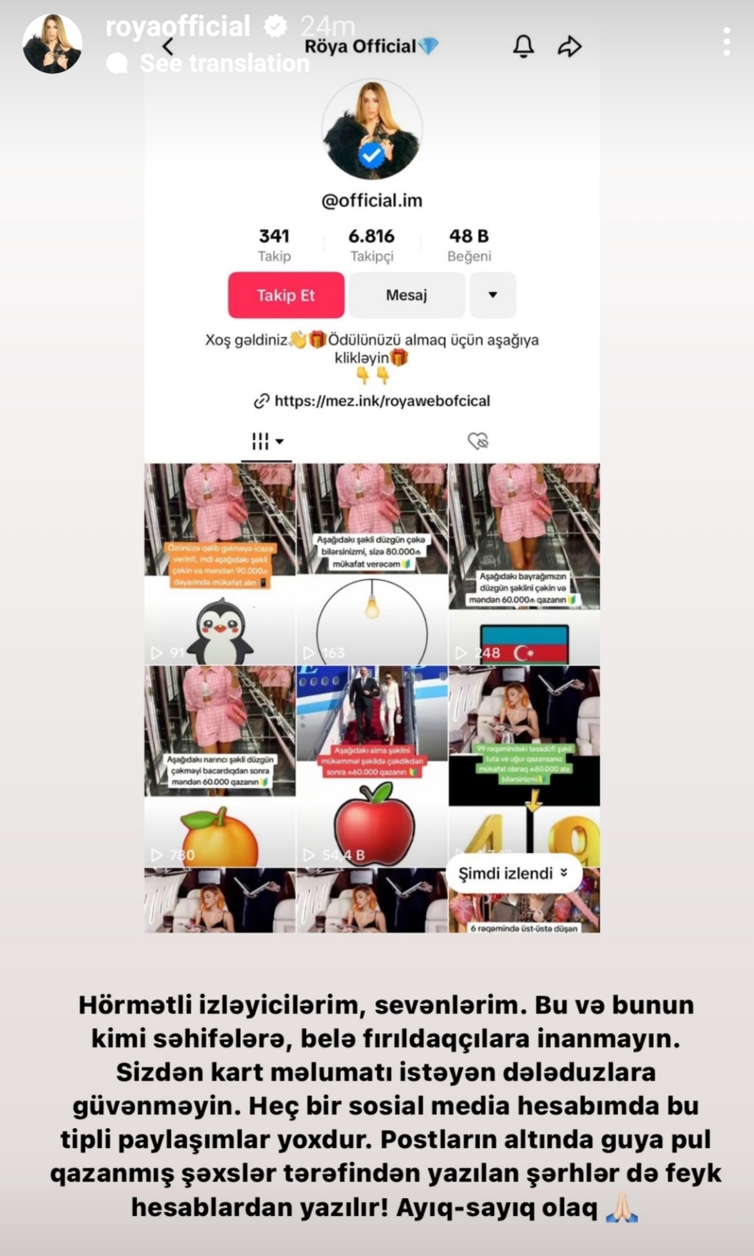"Belə fırıldaqçılara inanmayın. Sizdən kart məlumatı istəyən dələduzlara güvənməyin. Heç bir sosial media hesabımda bu tipli paylaşımlar yoxdur. Postların altında guya pul qazanmış şəxslər tərəfindən yazılan şərhlər də feyk hesablardan yazılır. Ayıq-sayıq olun!".